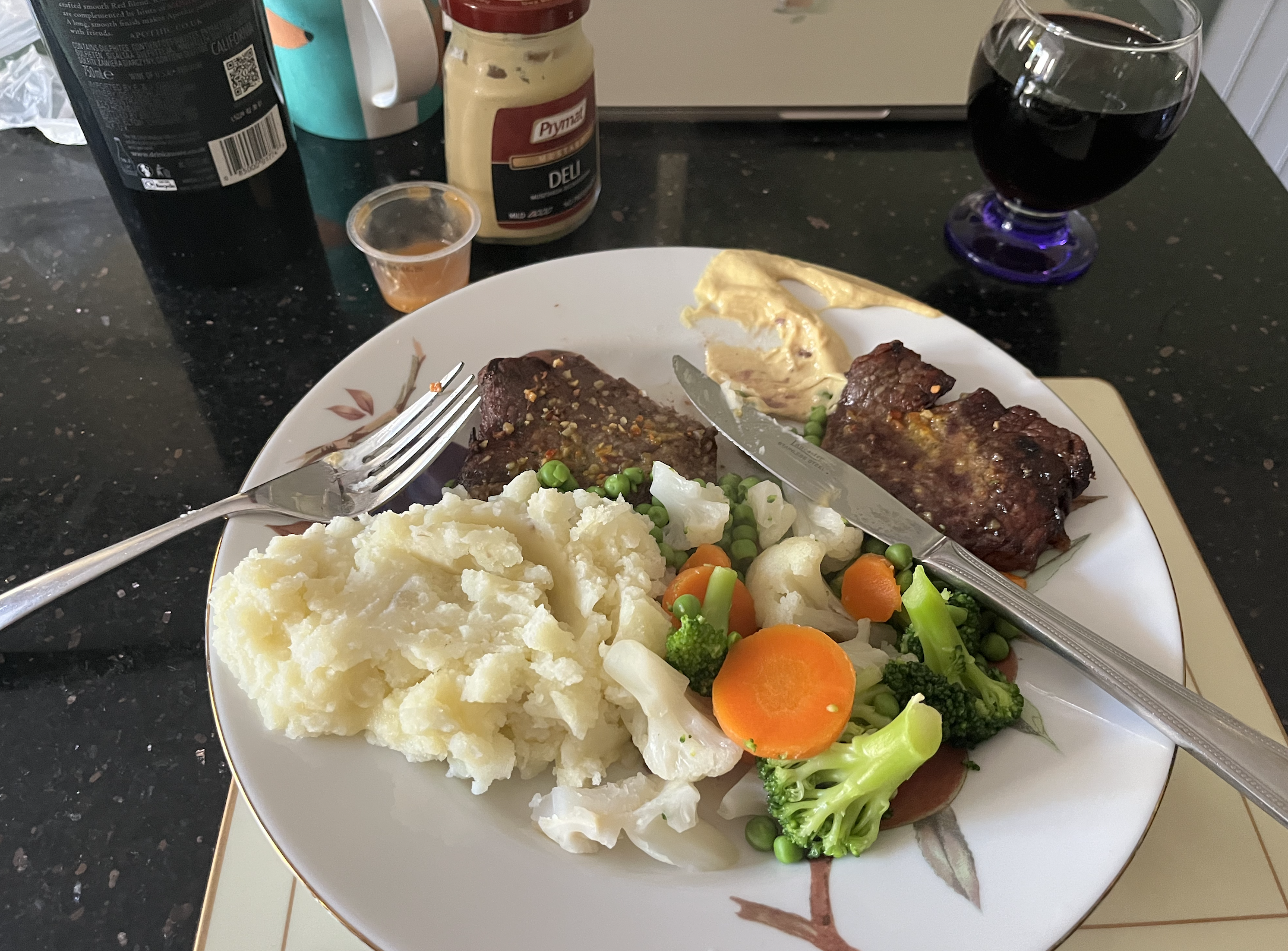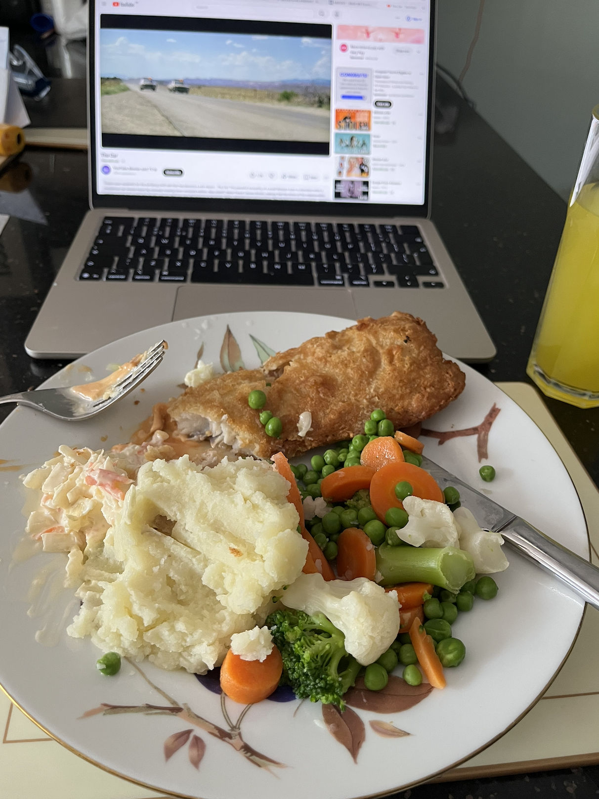 TV dinner. Lightly breaded cod with same mash and veg as yesterday, joined by a pint of orange squash..