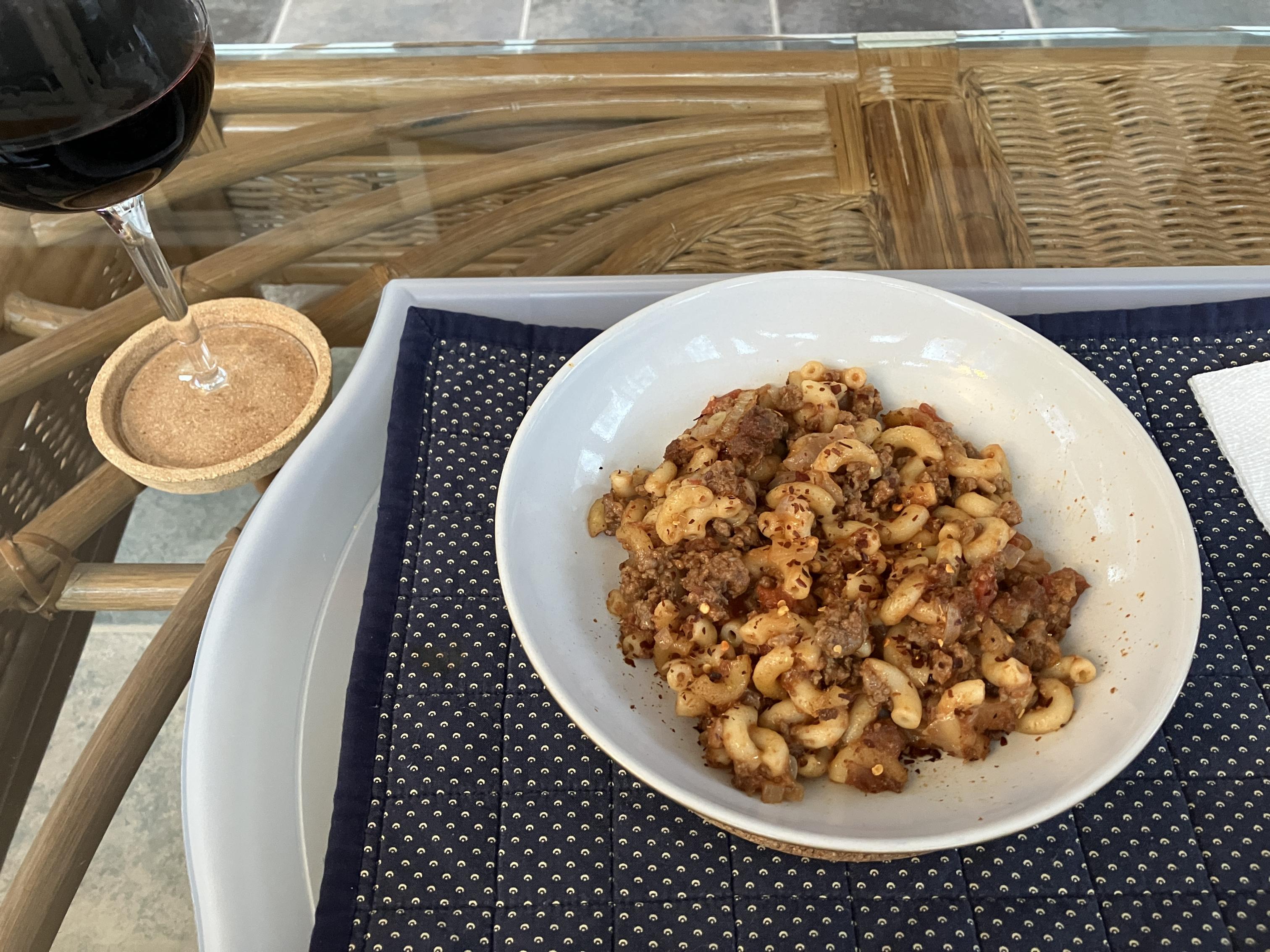 Homemade Mexican chilli (Ground Beef, Brothers Hot Pepperoni, Red Kidney beans, Mexican Rice, Chilli Pepper, Corn, bunch of Spices, Cheddar Cheese, Mozzarella Cheese and a side of Red Wine).