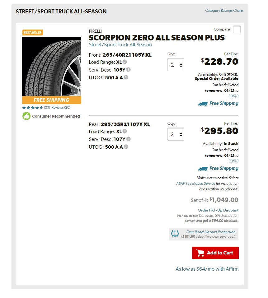 So I just swapped out the RFT for Pirelli Scorpion All Season Plus XL tires. The front size is 265/40/21 ($240 each) and 295/35/21 ($272 each) on the rear. The ride feels much better than the RFT and now I don’t have to be concerned about summer tires during the upcoming limited winter we have here in TX.